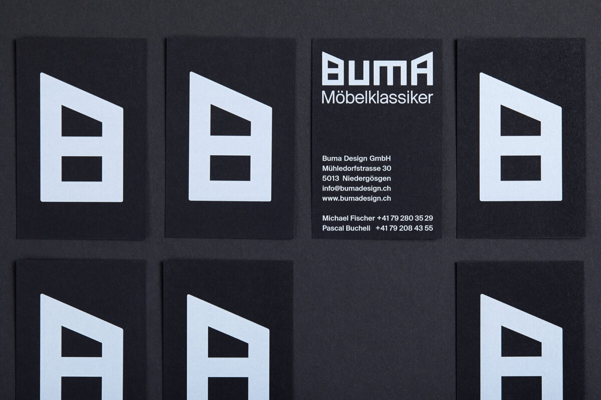 Der geometrische Schriftzug, orientieren sich an ihren Lieblingsobjekten – reduziert, klassisch und klar. Besonders ins Auge springt das markante Buma-B, woraus wir auch die Form der Hängeetiketten entwickelt haben. Durch eine Prägung des Buchstabens, wird die Hochwertigkeit der Möbel, an denen Sie angebracht werden, zusätzlich unterstrichen. Visitenkarten und Postkarten dienen als klassische Mittel, um potenziellen Kunden etwas in die Hände zu drücken.