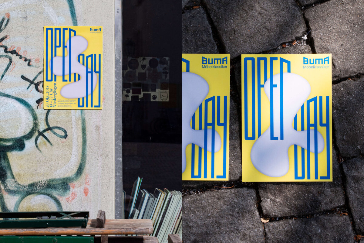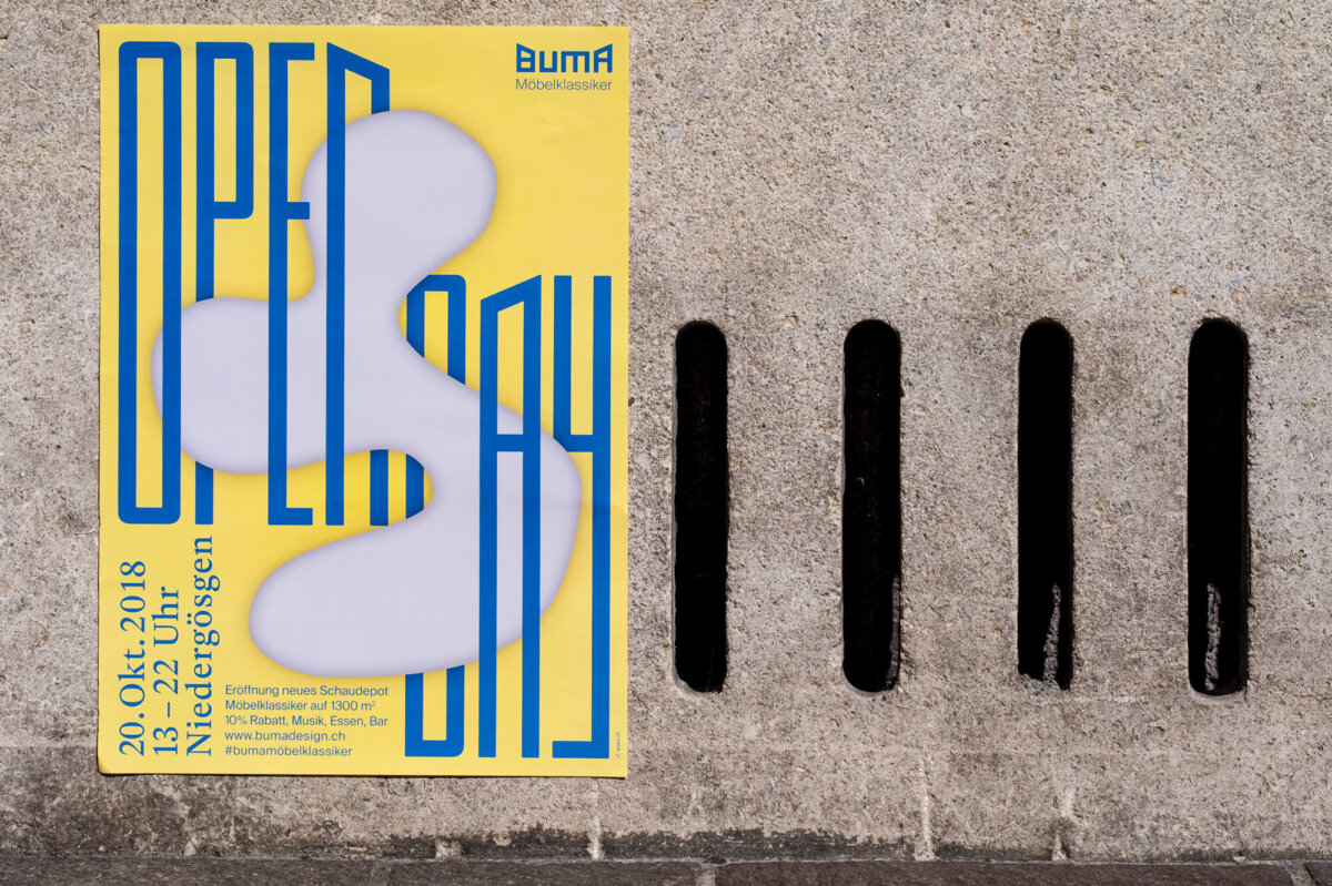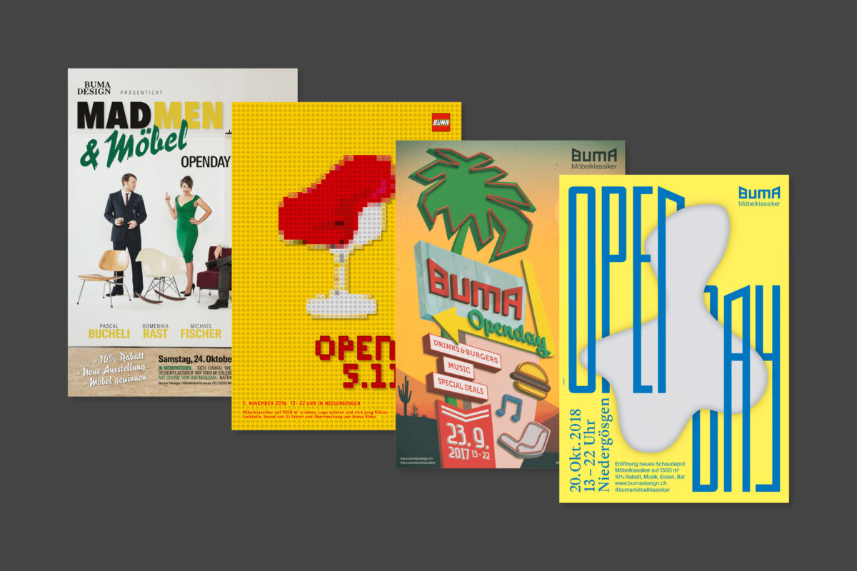 Um Einblick in das Sortiment, ihre Werkstätte und Räumlichkeiten auf dem Industrieareal in Niedergösgen zu geben, führten wir 2015 den ersten «Openday» ein. Zu einem spezifischen Thema wurde eine Erlebniswelt kreiert mit Möbel-Ausstellung, Live-Band, Bar und Food. Die Materie konnte so dem Publikum näher gebracht werden. Wir haben sie von der Ideenfindung, über die Bewerbung der Anlässe bis hin zur Planung und Organisation des Events unterstützt. Innerhalb von vier Jahren ist eine Plakat-Serie entstanden, welche die Eigenständigkeit der jeweiligen Opendays und dessen Thematik aufzeigt. Schliesslich entwickelte sich aus den eintägigen Events die «Buma Expo», eine exklusive Ausstellungs- und Verkaufsmesse von 200 Möbelklassikern aus 100 Jahren Designgeschichte. Diverse Veranstaltungen wie Referate, Führungen und Talks belebten über mehrere Wochen die Räumlichkeiten in Niedergösgen.