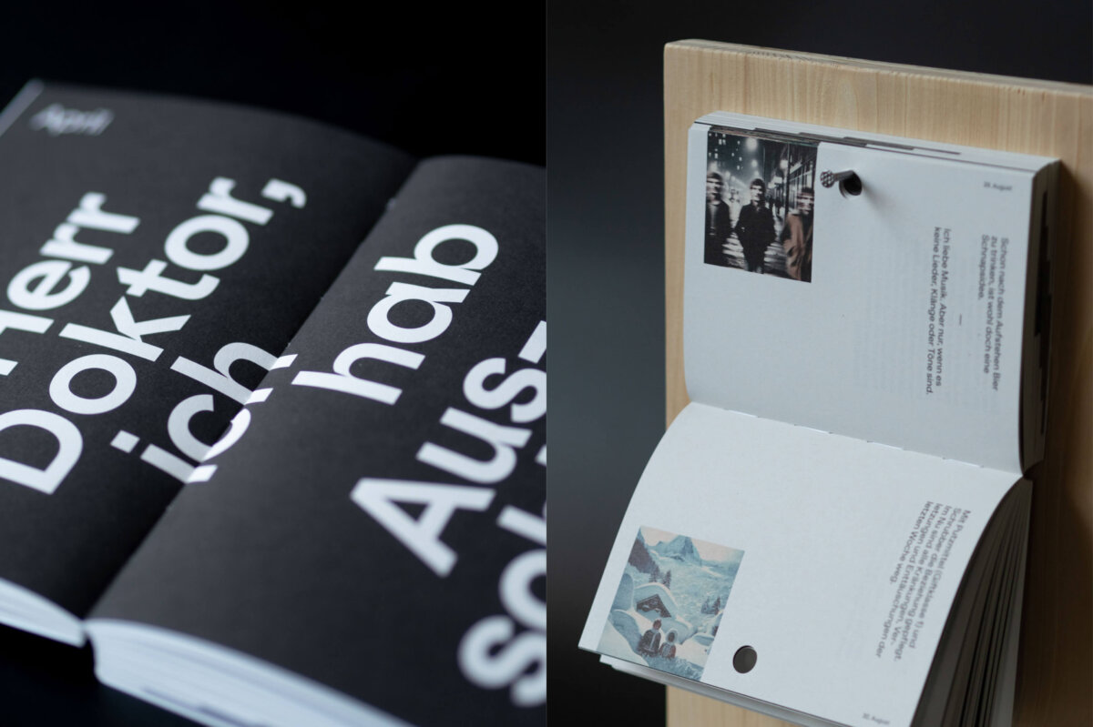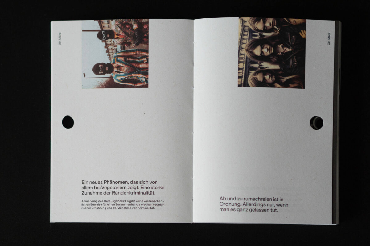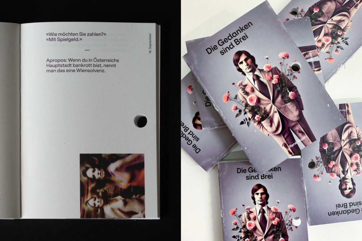 Das Ergebnis? «Die Gedanken sind Brei». Ein Buch mit Loch. Ja, ein Loch. Nicht nur absurd, sondern clever: Das Buch lässt sich an die Wand hängen. So wird es zum Objekt, zum täglichen Erlebnis, zum Kalender– oder eben doch nicht. Denn René wollte Letzteres ausdrücklich nicht.