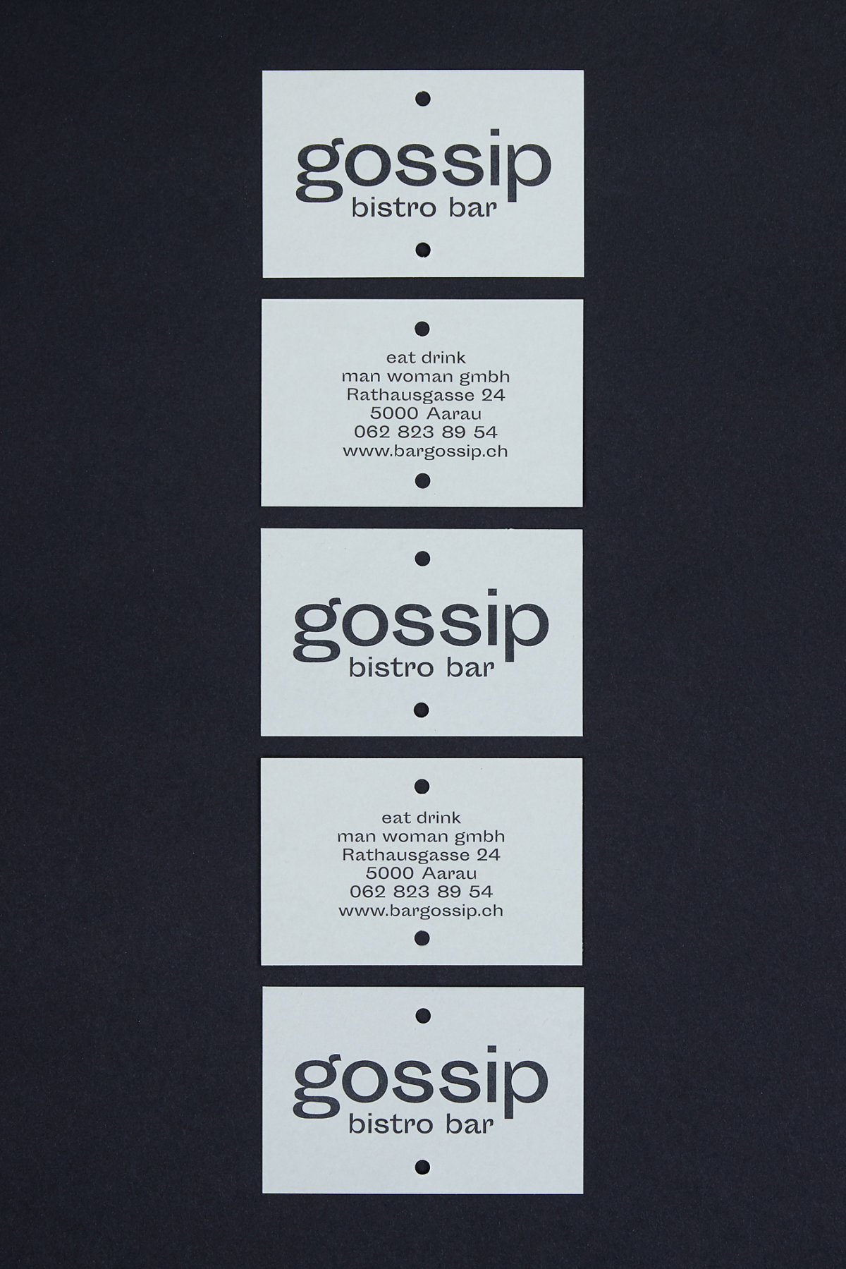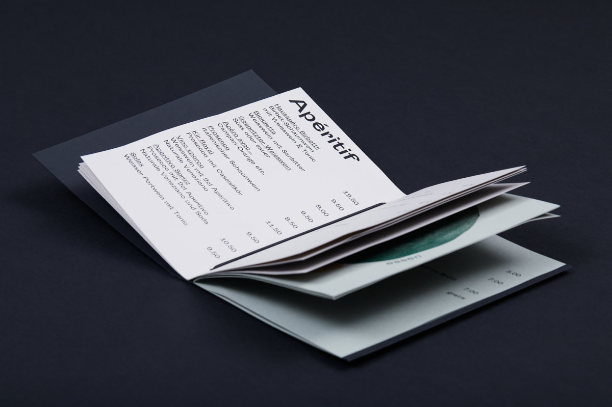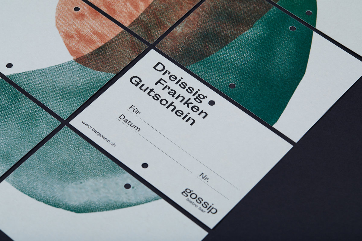 Als charakterstarktes Gestaltungselement aller Printprodukte (Speisekarte, Gutscheine, Visitenkarten) wählten wir eine Lochung. Bei der Speisekarte war die Idee, dass alle Innenseiten einfach ausgetauscht werden können. Dazu entwickleten wir ein System, bei dem Gummis das gelochte Papier zusammenhalten. Verspielt und eigenständig kommt die Lochung auch auf Gutscheinen und Visitenkarten zur Geltung und trägt zum einheitlichen Erscheinungsbild bei.