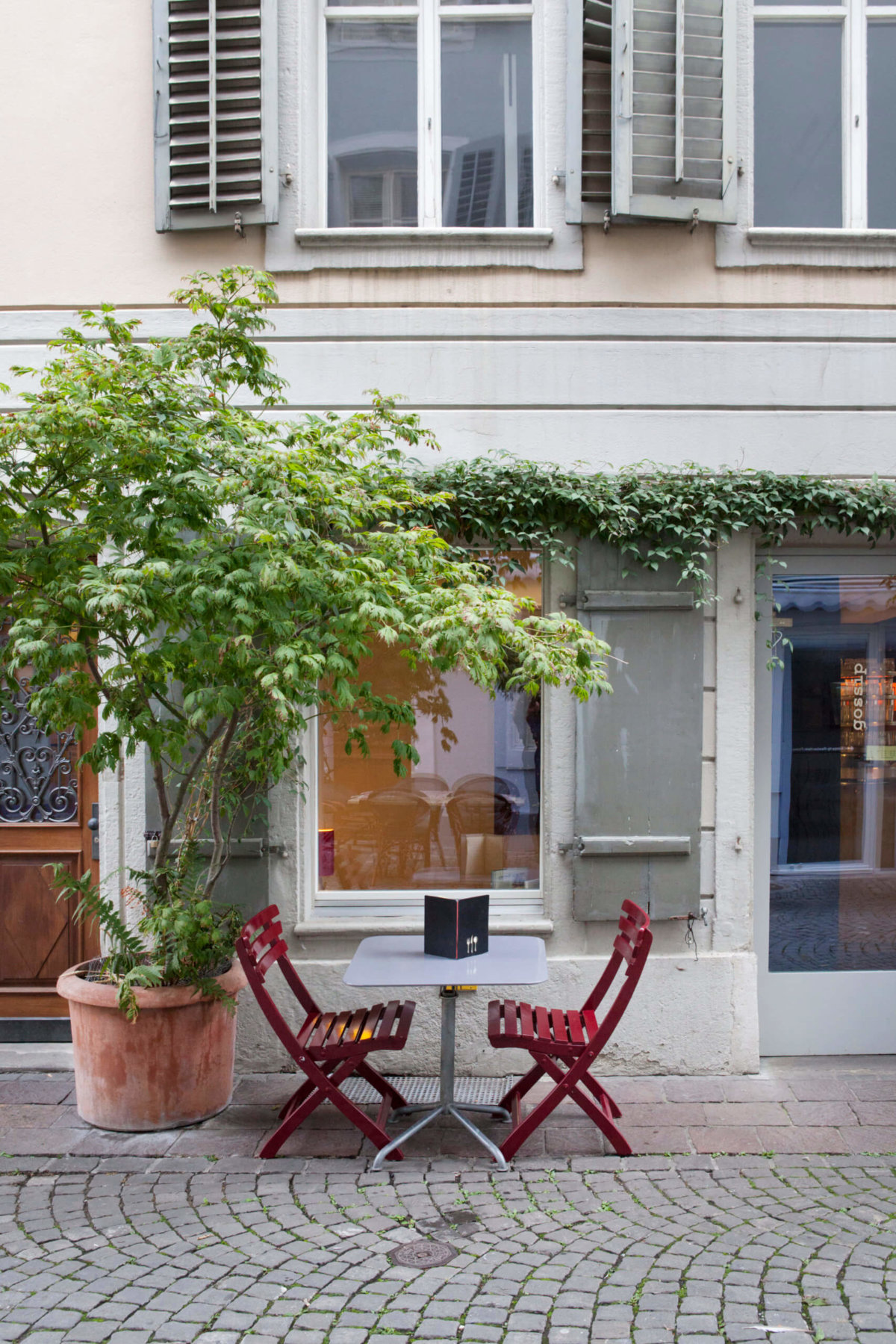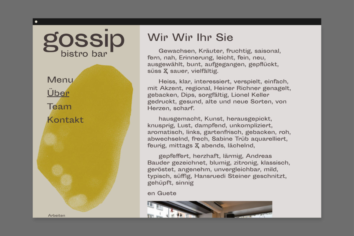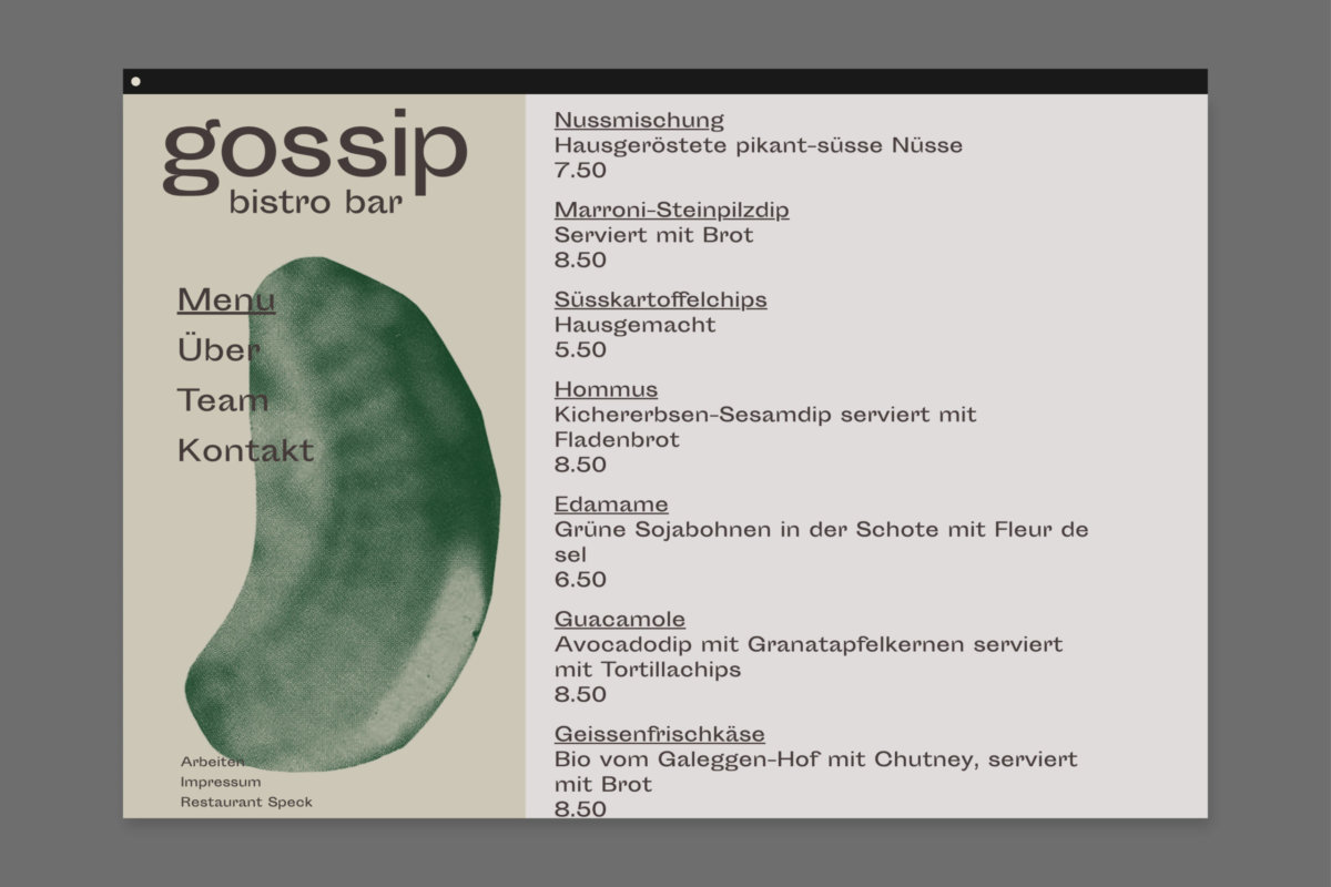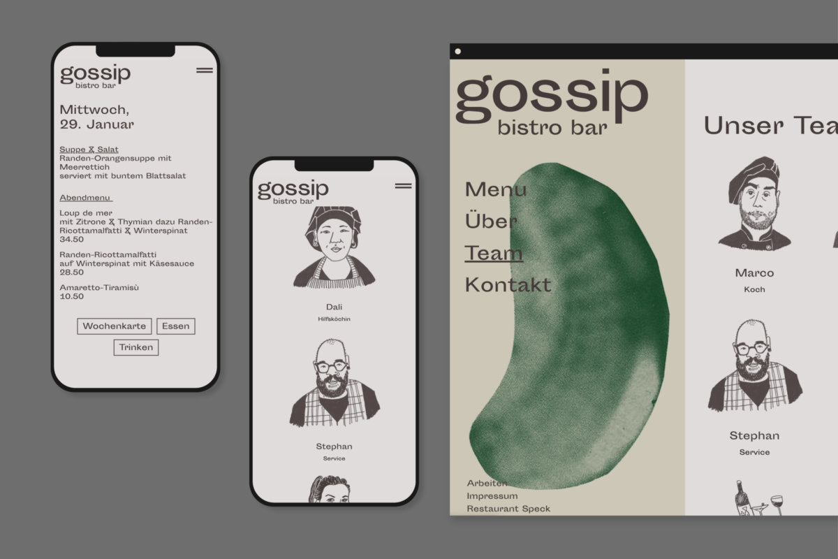 Als charakterstarktes Gestaltungselement aller Printprodukte (Speisekarte, Gutscheine, Visitenkarten) wählten wir eine Lochung. Bei der Speisekarte war die Idee, dass alle Innenseiten einfach ausgetauscht werden können. Dazu entwickleten wir ein System, bei dem Gummis das gelochte Papier zusammenhalten. Verspielt und eigenständig kommt die Lochung auch auf Gutscheinen und Visitenkarten zur Geltung und trägt zum einheitlichen Erscheinungsbild bei.