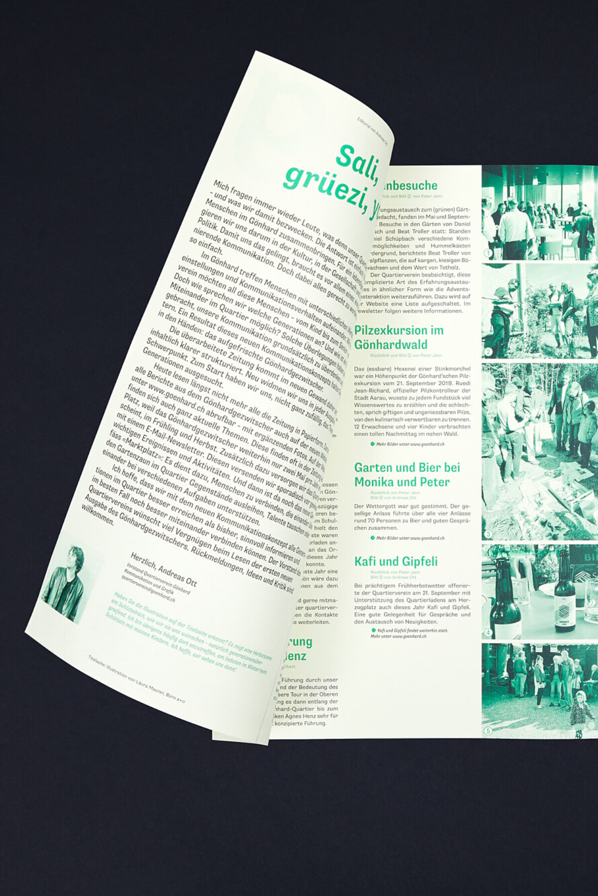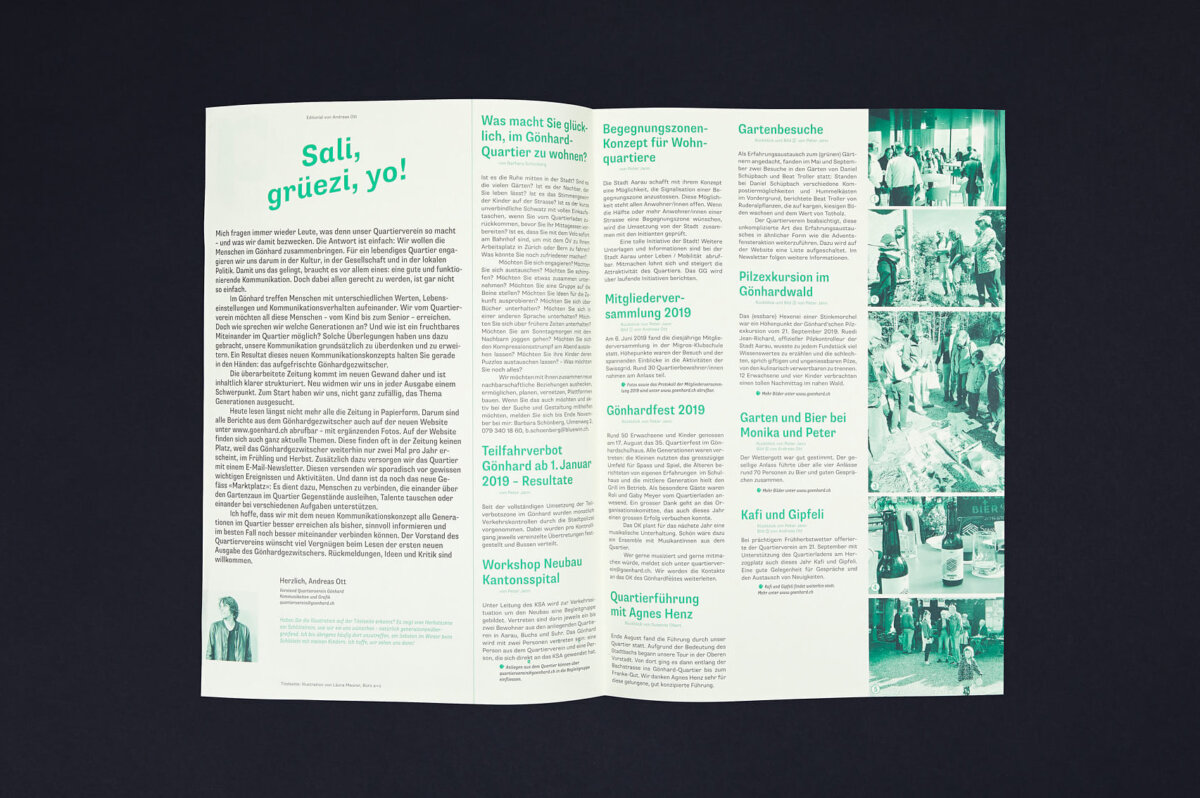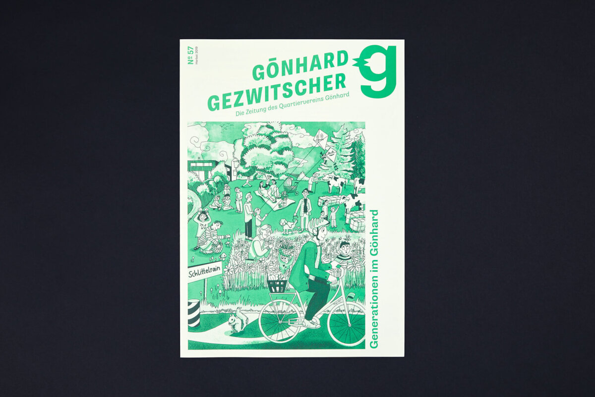 Das Anliegen des Quartiervereins Gönhard ist es, dass die BewohnerInnen sich mehr austauschen und treffen. Dies umzusetzen, war das Ziel von Andreas Ott vom Büro a+o. Er wohnt selber im Göni und ist im Vorstand des Quartiervereins für die Kommunikation zuständig. Seine Aufgabe war es, die Quartierzeitung und die Website konzeptionell, inhaltlich und gestalterisch aufzufrischen. Die Herausforderung: Die zweimal pro Jahr erscheinende Zeitung mit dem Namen «Gönhardgezwitscher» sollte die bis dahin eher ältere Leserschaft, neu jedoch auch jüngere Leute und Familien ansprechen. Gefragt für diesen Generationenspagat waren kreative Offline- und Onlinemassnahmen.
