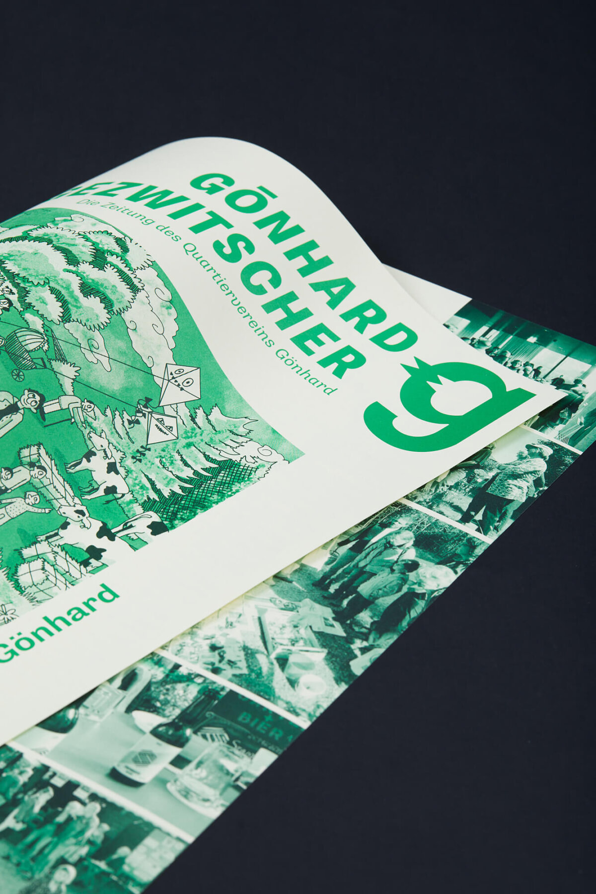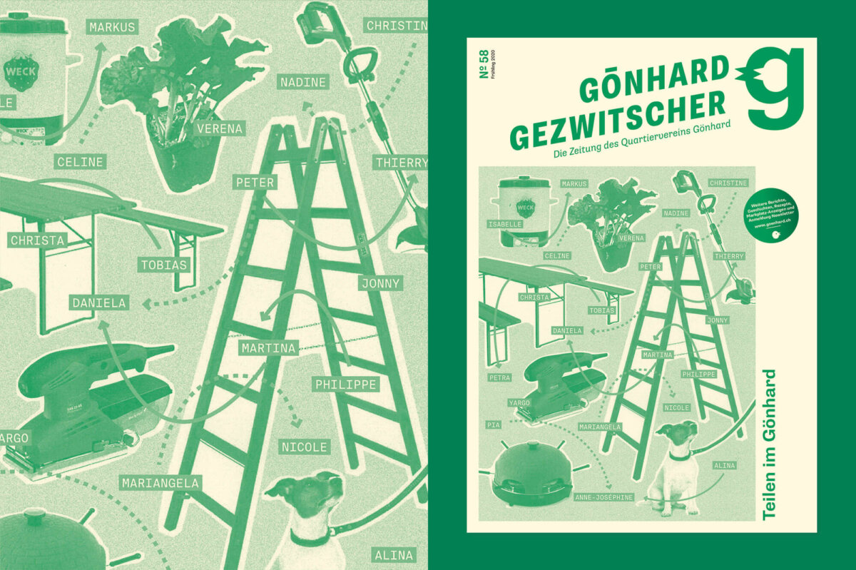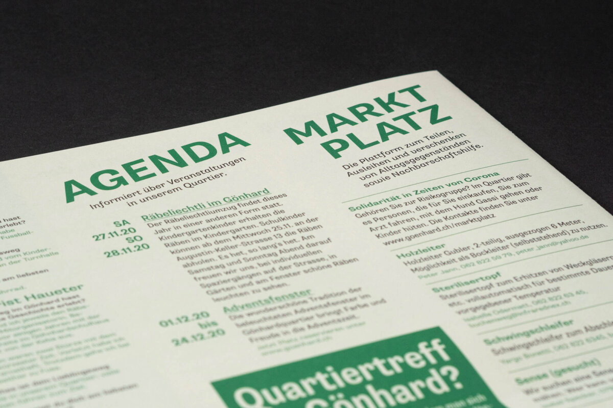 In Zusammenarbeit mit dem Vorstand des Quartiervereins hat das Büro a+o fixe Gefässe geschaffen, die sich in jeder Ausgabe der Zeitung wiederholen. Neu widmet sich zudem jede Ausgabe der Zeitung einem Schwerpunkt. Um die Geselligkeit im Quartier zu fördern und weil die Gönhardianer gern teilen, gibt es neu zudem einen fiktiven Markplatz zum Ausleihen von Dingen und für die Nachbarschaftshilfe. Auch auf der neu gestalteten Website ist der Marktplatz und Kalender integriert und somit immer abrufbar. Auch die Beiträge aus der Zeitung können online gelesen werden.