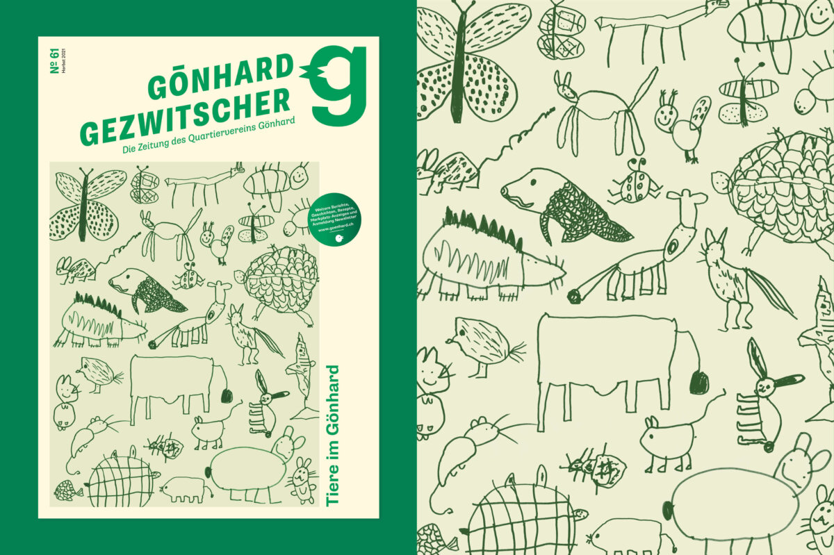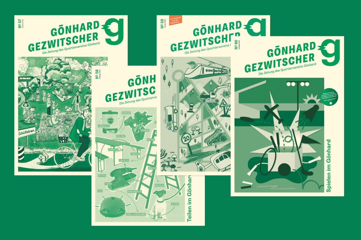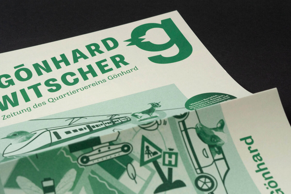 Als Basis für den Neuauftritt der Quartierzeitung überarbeitete das Büro a+o die Marke «Gönhardgezwitscher». Das dazu entwickelte Zeichen nimmt Bezug auf den Inhalt und ist vielseitig anwendbar. Die Wort-Bildmarke steht neu für die gesamte Kommunikation im Quartier. Egal, ob Mund zu Mund über den Gartenzaun, in der Zeitung, digital per E-Mail-Newsletter oder auf der Website.