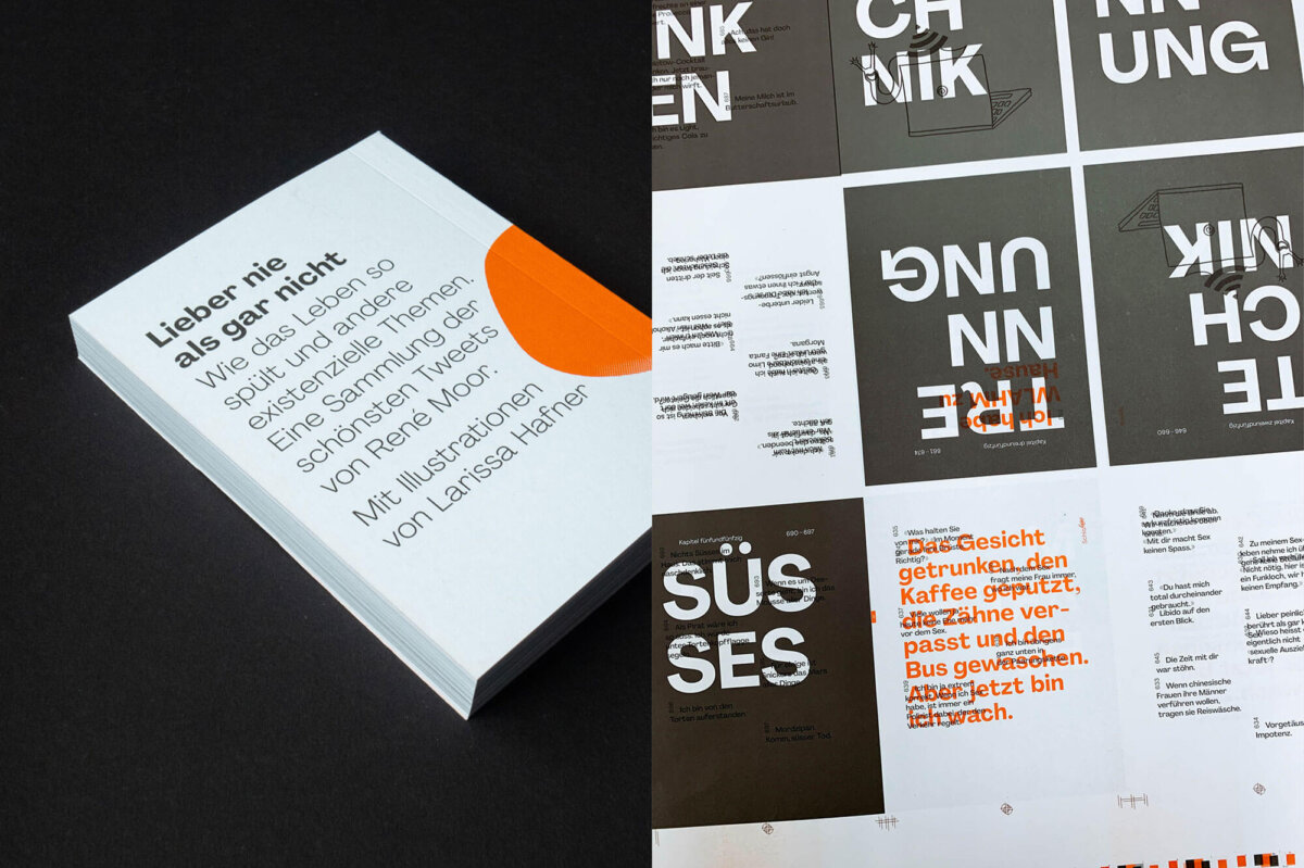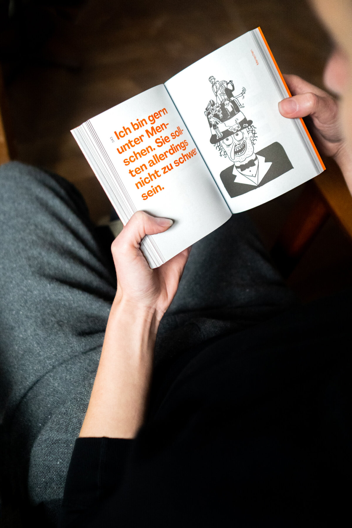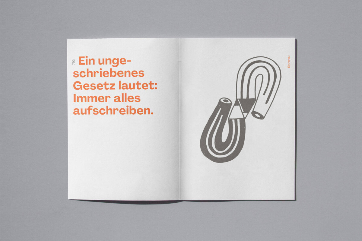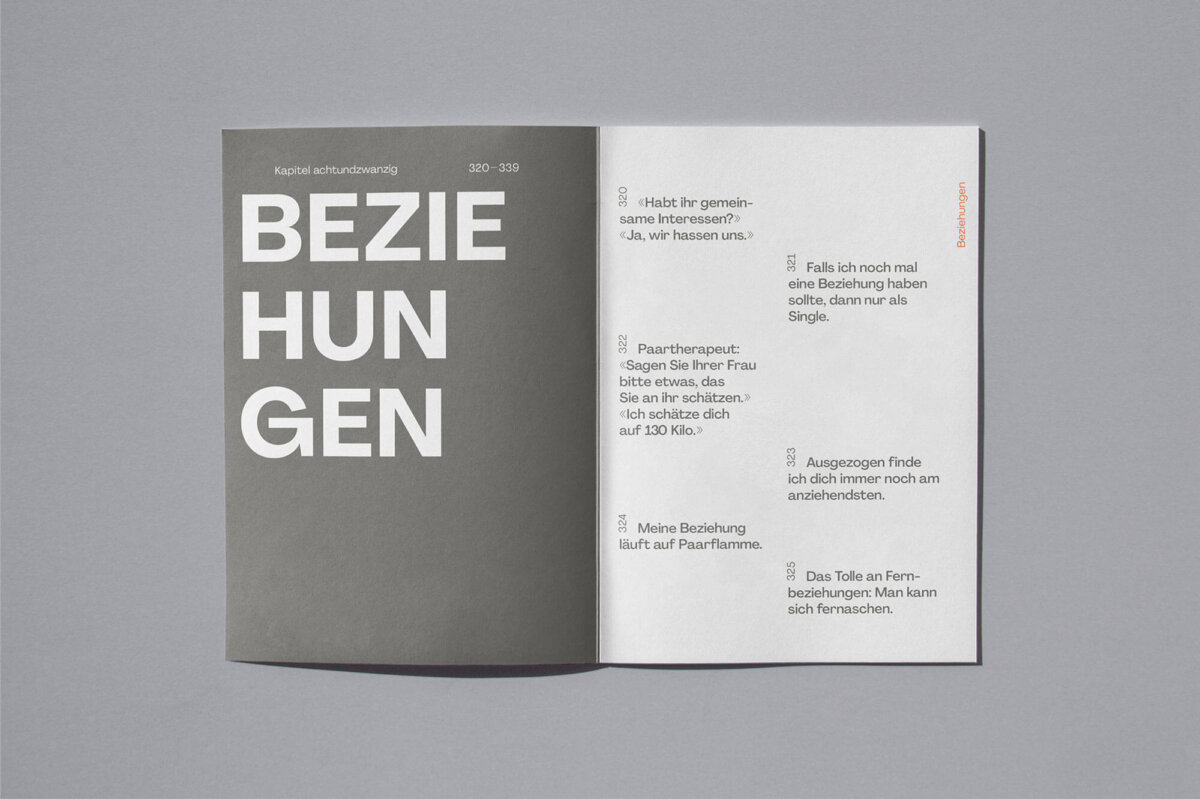 Format, Titel und Inhalt (bis auf das neue Kapitel) haben wir belassen wie beim Original. Geschraubt haben wir dafür bei den Farben, der Schrift und beim Papier. Dazu haben wir Details im Layout angepasst. So wirkt das Büchlein nun erwachsener, selbstbewusster und reduzierter. Und die Wortspielereien kommen noch besser zur Geltung.