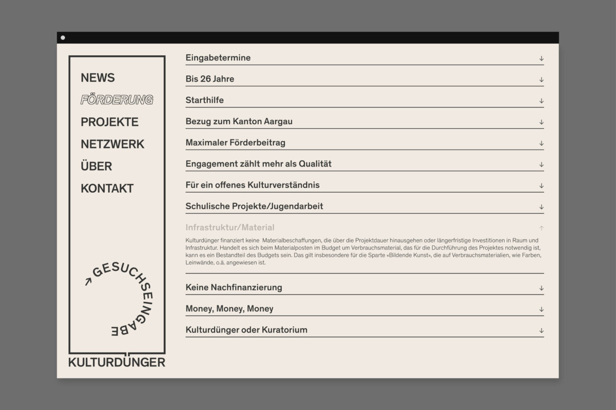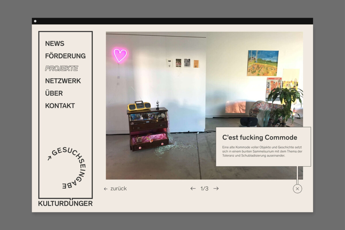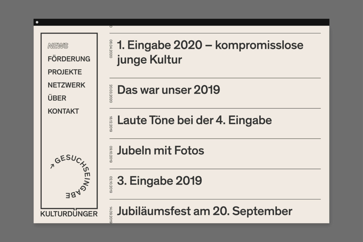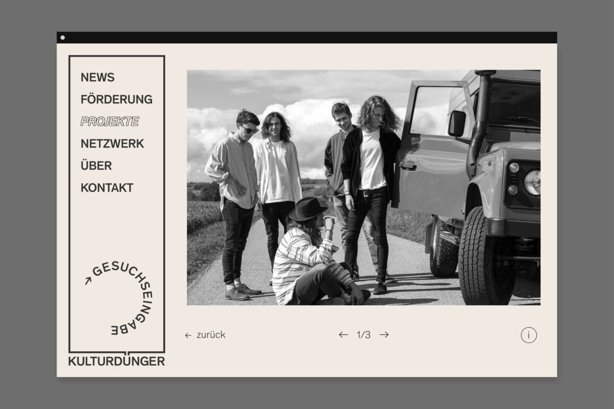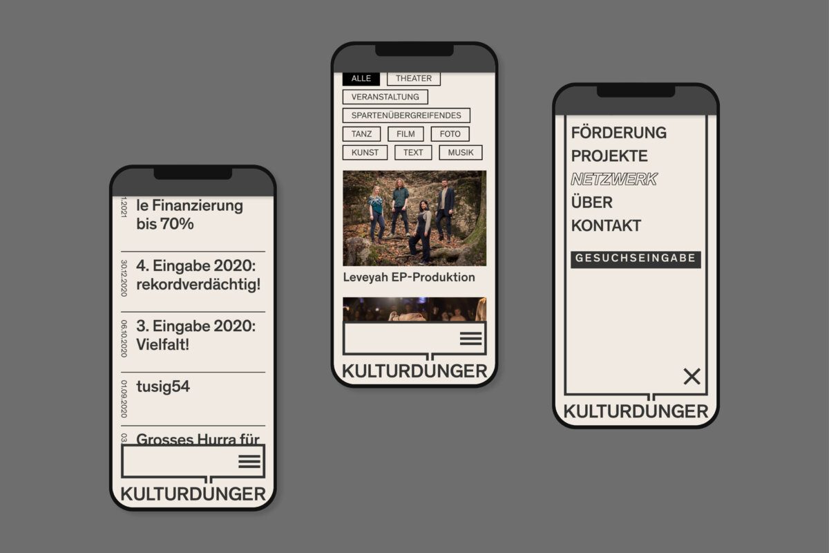 Aufgabe des Büro a+o war es, eine Website mit neuen Funktionen zu entwickeln. Das Zentrale Element der Website sollte dabei ein für alle Interessierten zugängliches Netzwerk sein. Mit einem neuen Logo und einer neuen Bildsprache galt es, das Profil von Kulturdünger weiter zu schärfen. Mit Plakaten im öffentlichen Raum, über Social Media und mit der Website sollten zudem bereits unterstützte Projekte gezeigt werden. Dies soll junge Kulturschaffende ermutigen, eigene Projekte einzugeben.