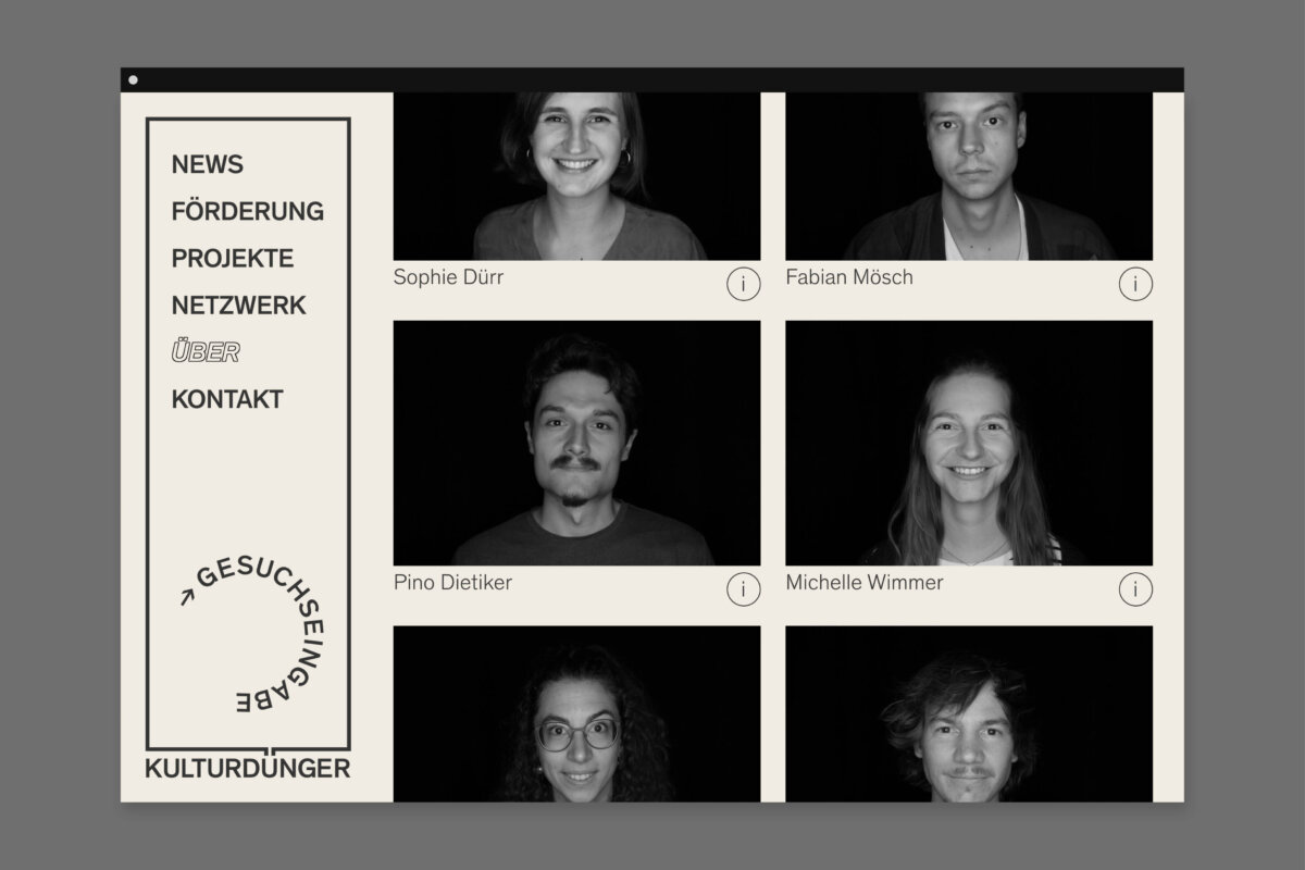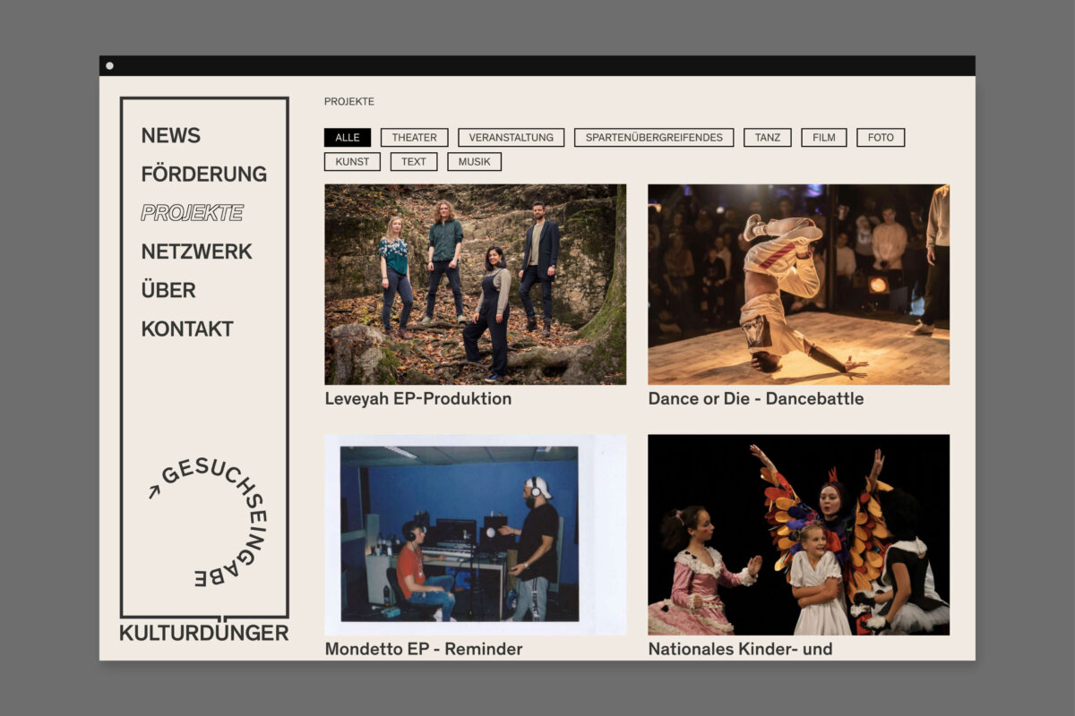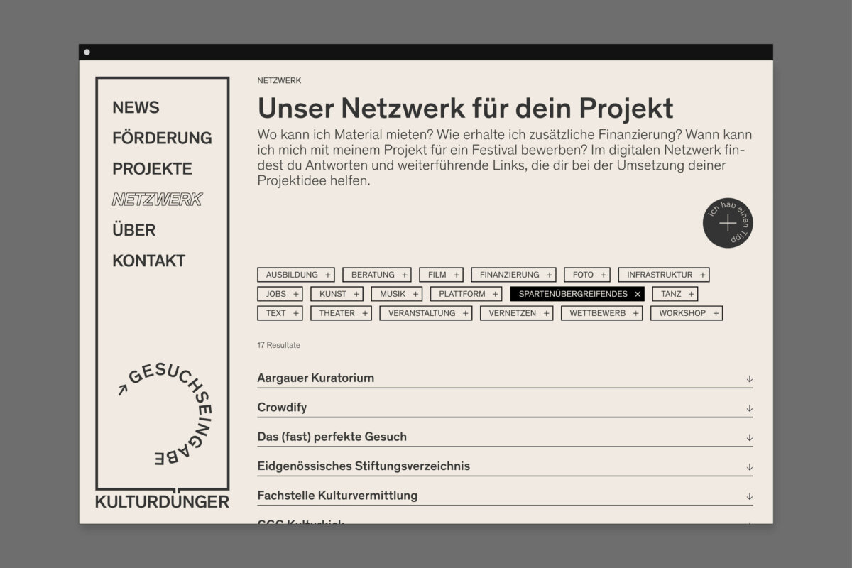 Der Menüpunkt «Netzwerk» bildet den Kern der Website. Hier finden Interessierte über eine Filterfunktion schnell und einfach alle gewünschten Informationen. Zudem sind bereits umgesetzte Projekte mit Text und Bild auf der Website dokumentiert. Dies zeigt die Bandbreite des Engagements von Kulturdünger auf und dient jungen Kulturschaffenden als Inspiration für mögliche neue Projekte.