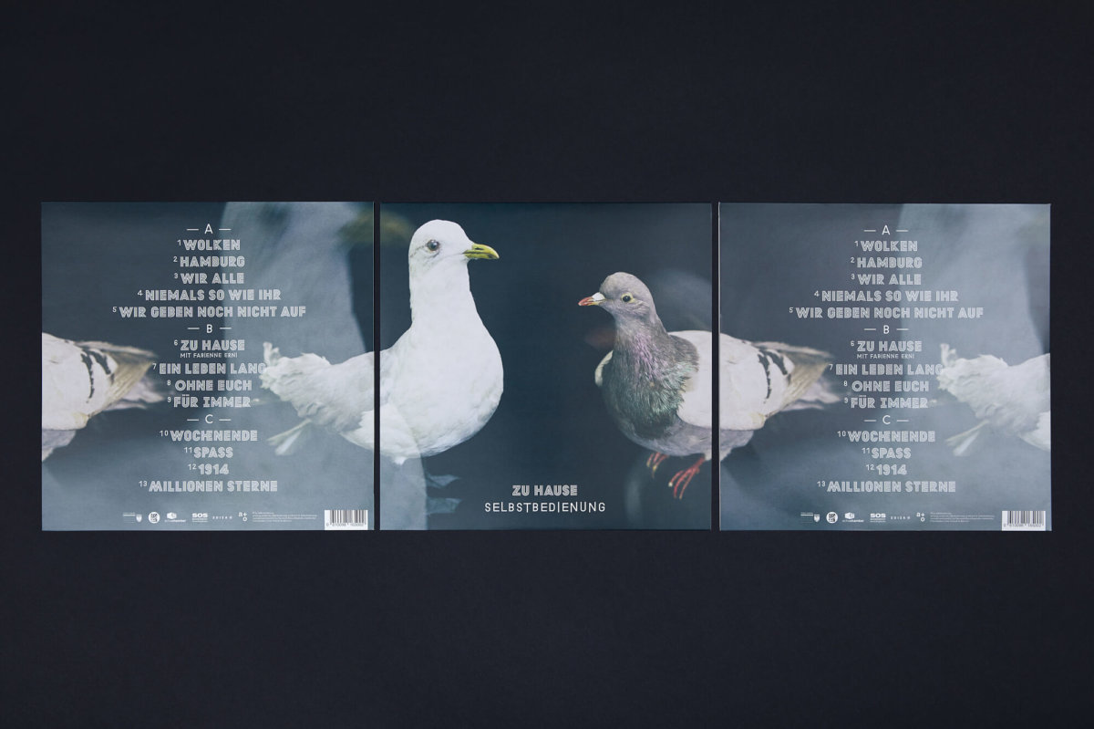 Release des Albums «Zu Hause»: Das Keyvisual für das vierte Album der Punk-Band ist – so wie die Musik – erwachsener geworden. Das Büro a+o übersetzt das Thema der Platte mit einer Metapher. Die beiden Vögel stehen für die zwei Städte, in denen Selbstbedienung zu Hause ist. Typisch für Aarau ist die Taube – in Hamburg gilt das für die Möwe. Die beiden von uns auf dem Cover inszenierten Vögel stammen vom Museum Naturama in Aarau. Dieses geflügelte Motiv durchzieht die ganze Kommunikation für das Album, die Mini-Releases und den dazugehörigen Animationsfilm.