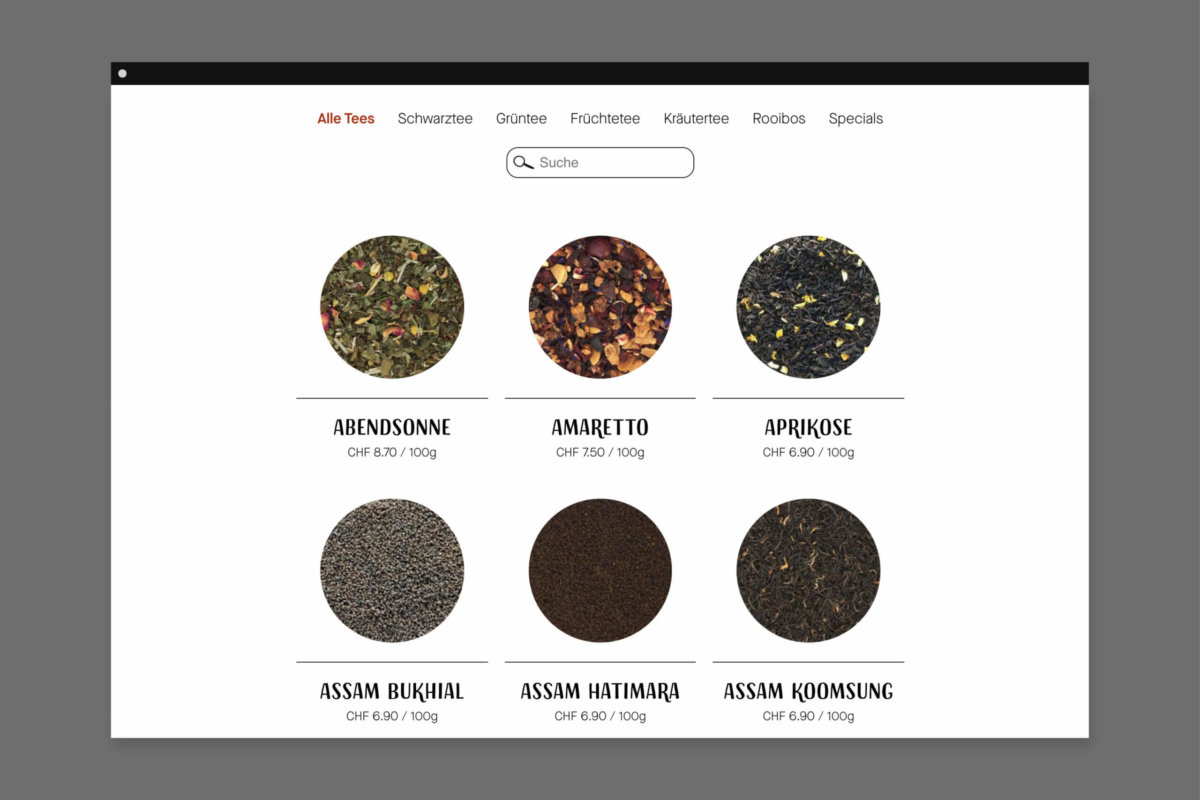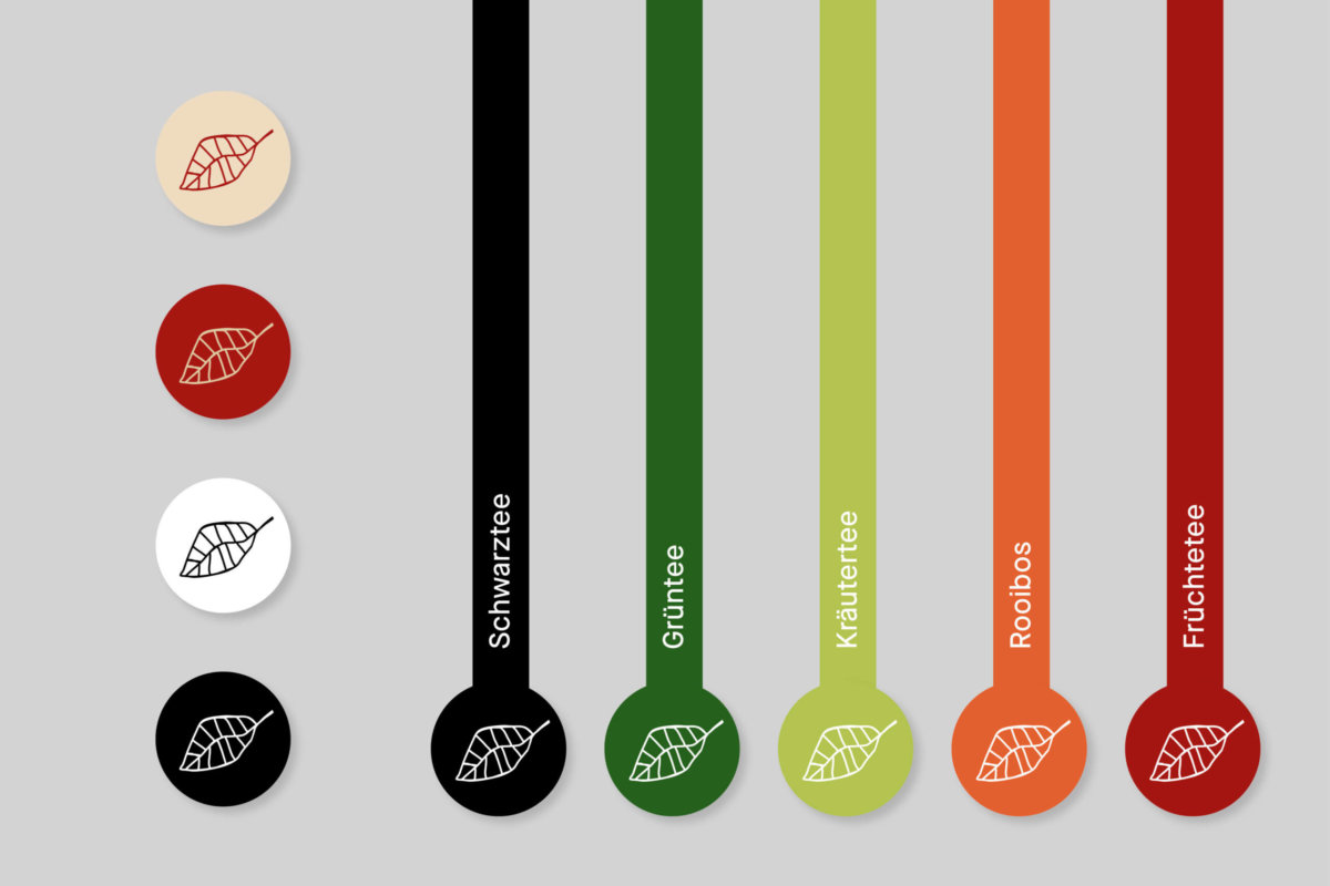 Verschiedene Produktlinien, wie Früchte-, Grün- oder Schwarztee, sind farblich ersichtlich und schaffen Orientierung in der Welt der Teesorten. Spezielle Tees heben wir durch zusätzliche Illustrationen hervor.