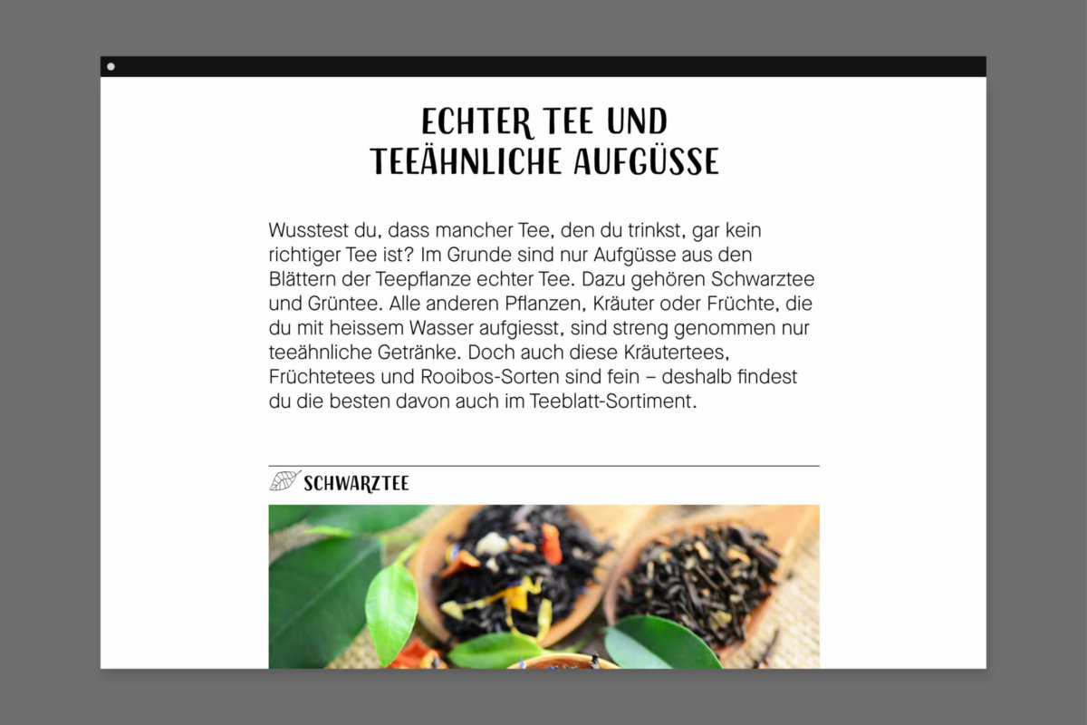 Auf der Website findet sich, neben den Produkten, im Journal auch Wissenswertes rund um Tee allgemein. Dies wird ergänzt durch den klar strukturierten und logisch aufgebauten Onlineshop. Hier landet man mit wenigen Klicks bei seinem Lieblingstee und kann diesen ganz einfach bestellen.