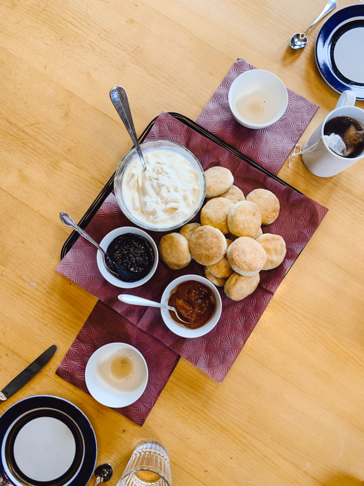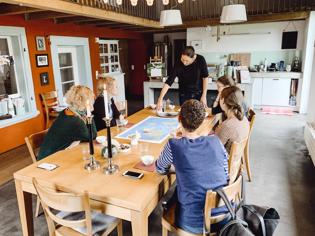 Bettina beginnt mit gelassener Stimme von Oolong, schwarzem, weissem, grünem und gelbem Tee zu erzählen. Sie nimmt uns mit nach Asien, auf riesige Teeplantagen und in die Wohnzimmer der Engländer, mit Earl Gray und Scones. Letztere hat sie sogar selbst gebacken, original serviert mit geschlagenem Rahm und Marmelade, dazu Matcha-Plätzchen und Pralinés.