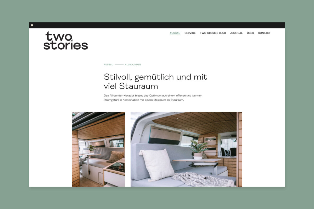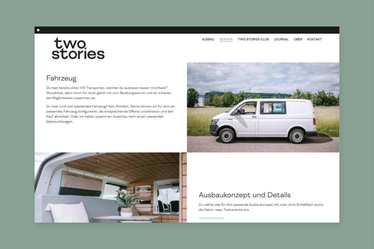 Ein kleines Zuhause auf vier Rädern – das macht Two Stories möglich. Nicole und Martin sind leidenschaftliche Camper und selber regelmässig mit ihrem VW Bus unterwegs. Deshalb wissen sie genau, was es für einen optimalen Ausbau braucht, damit der Urlaub besonders schön wird. Das Büro a+o wurde für das Rebranding der Marke und der Konzipierung einer neuen Webseite beauftragt.