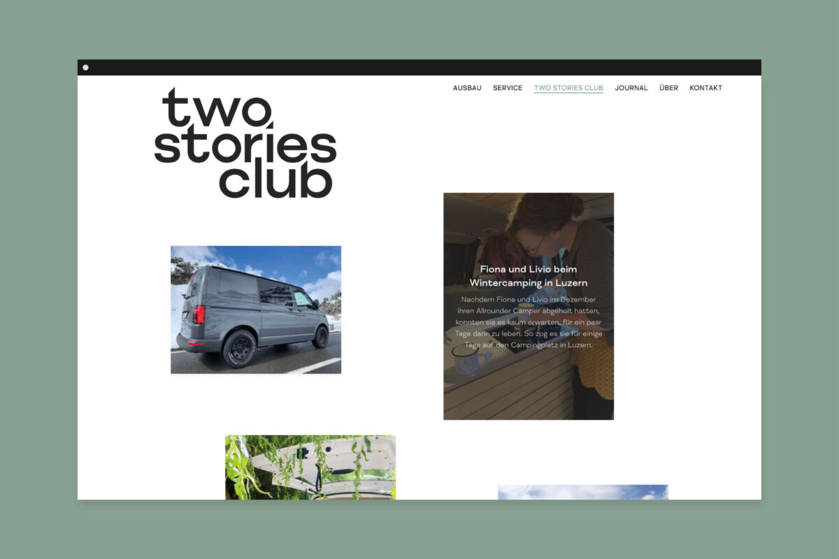 Rund um die Marke Two Stories soll eine Community entstehen, mit der Tips und Erinnerungen geteilt werden können. Deshalb entstand während dem Prozess der sogenannte Two Stories Club. Auf der Website erhalten Nutzer die Möglichkeit, dort ihre liebsten Bilder und Erinnerungen hochzuladen und für die Öffentlichkeit sichtbar zu machen. Eine Sammlung von Orten, die von glücklichen Kunden mit ihrem neuen Bus bereist wurden.